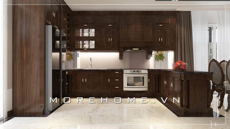 Tủ bếp chữ U gỗ tự nhiên cao cấp tạo vẻ đẹp sang trọng cho không gian nhà phố, biệt thự.