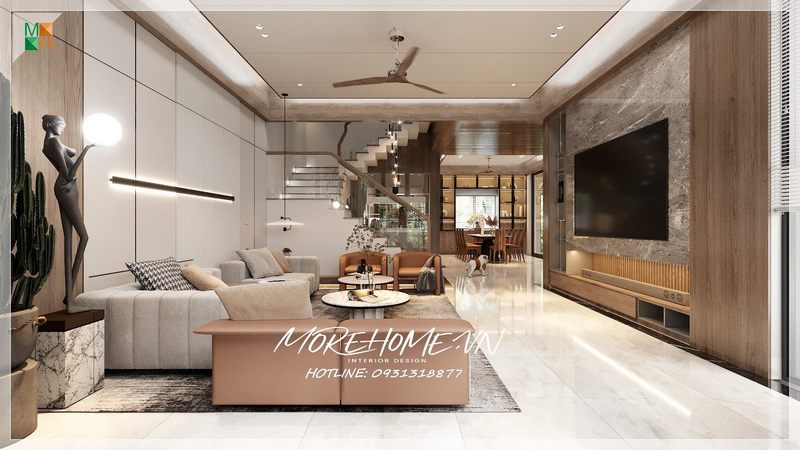 Thiết kế vách tivi bằng đá đối vân cao cấp mang đến điểm nhấn nổi bật, ấn tượng cho không gian phòng khách