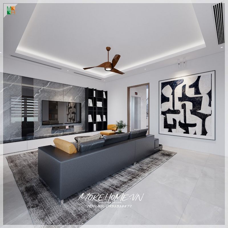 Một phòng khách sang trọng phụ thuộc vào nhiều yếu tố tạo thành trong đó cách bày trí đá ốp vách tivi vân mây tạo điểm nhấn mạnh mẽ sức hút hiện đại cho phòng khách