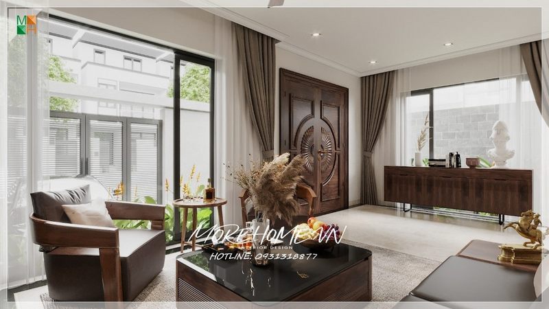 Mẫu cửa kính khung gỗ 2 cánh rộng và thông thoáng tạo sự sang trọng cho không gian nhà nói chung cho phòng khách nói riêng.