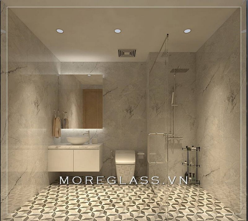 Mẫu thiết kế nhà vệ sinh nhỏ gọn sử dụng vách tắm kính cường lực giúp tạo ra cảm giác thoáng đãng cho phòng tắm.
